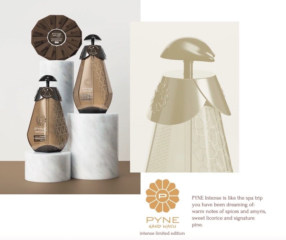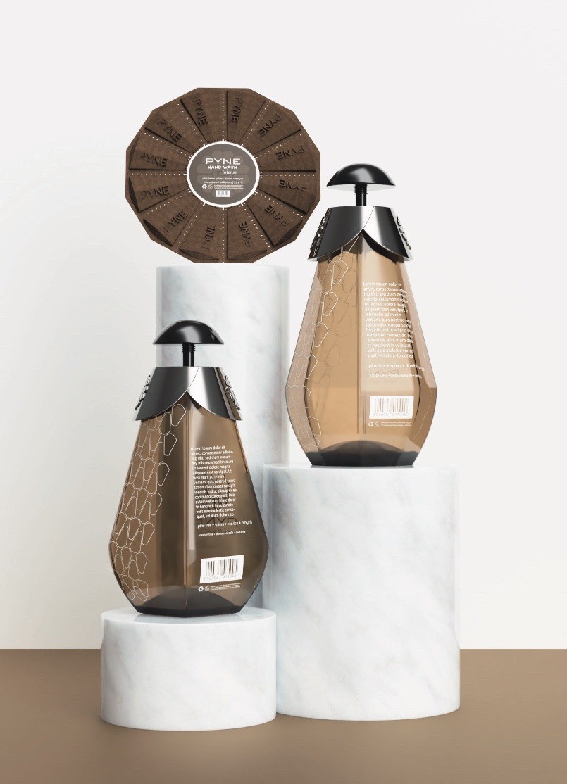 我的概念是從創(chuàng)建一個品牌開始的。我知道我會參考松果的設(shè)計,所以我希望整個品牌都與松樹有關(guān)。在我的仿生書中,用審美選擇暗示主題是可以的,只要它是為了建立品牌的背景,并且一切都與作為最終產(chǎn)品呈現(xiàn)的具有凝聚力的故事的消費者相關(guān)。我為PYNE洗手液產(chǎn)品線提供的三種變體制作了三種香水配置文件。三者都以松樹作為共同的音符,創(chuàng)造了一致的嗅覺品牌標(biāo)識。派恩洗手液是原版的主要變體;它有一個標(biāo)志性的,泥土的,平衡的特點與廣藿香,松子,檀香木的額外注意。原作是一款即時經(jīng)典,給人一種優(yōu)雅的感覺。這些品質(zhì)也體現(xiàn)在包裝設(shè)計中:在長方形瓶身上有一個柔和的調(diào)色板,帶有米色和深綠色。派恩洗手液antibac有一個泡沫,脆,明亮的個性與杜松漿果,羅勒,和帕洛桑托作為補充說明??箟难嶙兎N讓人想起在溫暖的夏天喝杜松子酒補品,因為它將衛(wèi)生與新鮮聯(lián)系在一起。瓶子的設(shè)計是球狀的,主要是白色,帶有藍(lán)色和綠色的色調(diào),窗戶可以窺視里面的洗手液。另一方面,PYNE hand Wash Intensive限量版則與之完全相反,添加了香料、甘草和苦杏仁,創(chuàng)造了一種美食家、深度和奢華的體驗。這就像你夢寐以求的水療之旅,裝在一個瓶子里,它有著多面的寶石般的形狀,由琥珀色的玻璃和白色印刷的圖形元素組成。