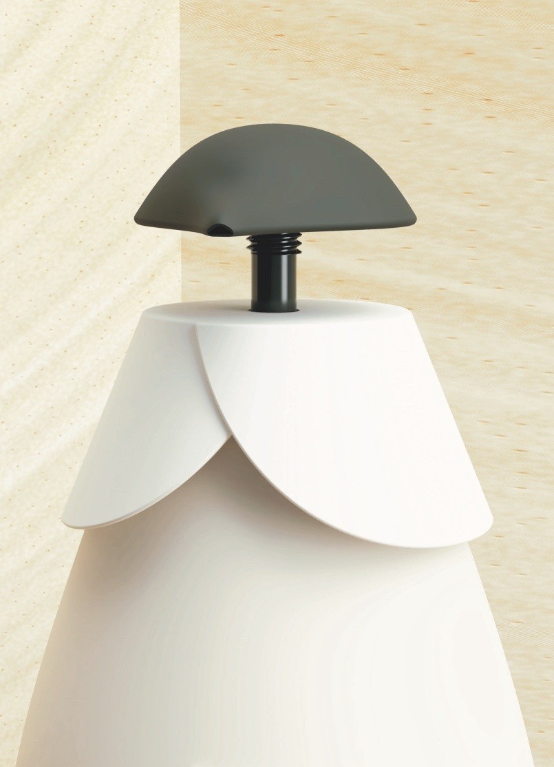 通過使用場景可以觀察到轉(zhuǎn)化為我的設(shè)計的松果的特性。每一瓶派恩洗手液都有一個“補充種子”,一個由雞蛋盒狀的再生紙制成的小袋,里面裝滿了粉末狀的洗手液。然后,用戶將粉末倒入瓶中,就像松果的鱗片將水輸送到莖部一樣,將粉末與水混合,在家中制作產(chǎn)品。這節(jié)省了運輸重液體洗漱用品的成本和碳足跡。補充種子也可以單獨購買12粒種子的光盤,類似于派恩標(biāo)志。材料和形式創(chuàng)造了一個獨特和可持續(xù)的品牌機會,因為種子可以用徽標(biāo)壓花,而不需要墨水打印,同時所需的法律信息可以包含在單個中央標(biāo)簽上。此外,光盤可堆疊,從而節(jié)省貨架空間。填充種子的整體設(shè)計在不同的變體中相似,只是顏色和標(biāo)簽設(shè)計不同。另一個常見的部件是蓋和泵系統(tǒng)。形狀相似,表面處理和顏色略有變化,降低了模具成本,因為同一模具可與不同的顏料顆粒重復(fù)使用。設(shè)計語言應(yīng)該散發(fā)出保護的感覺,瓶蓋幾乎包裹著瓶子,因為它固定在瓶頸上。將泵固定在瓶子上的螺旋運動也模仿了松果的分形結(jié)構(gòu),從上到下螺旋運動。致動器為圓頂形,除了確保符合人體工程學(xué)的設(shè)計外,還將產(chǎn)品與競爭對手區(qū)分開來,因為在洗手包裝設(shè)計中,分配器泵作為一個獨特的功能經(jīng)常被忽略。每種派恩洗手液有兩種尺寸:350毫升和700毫升