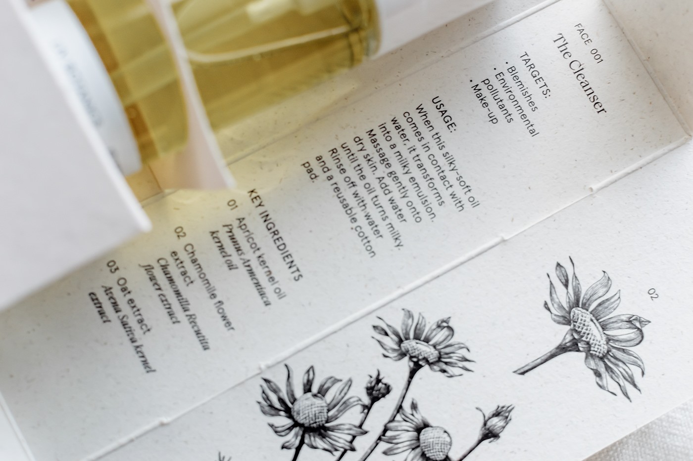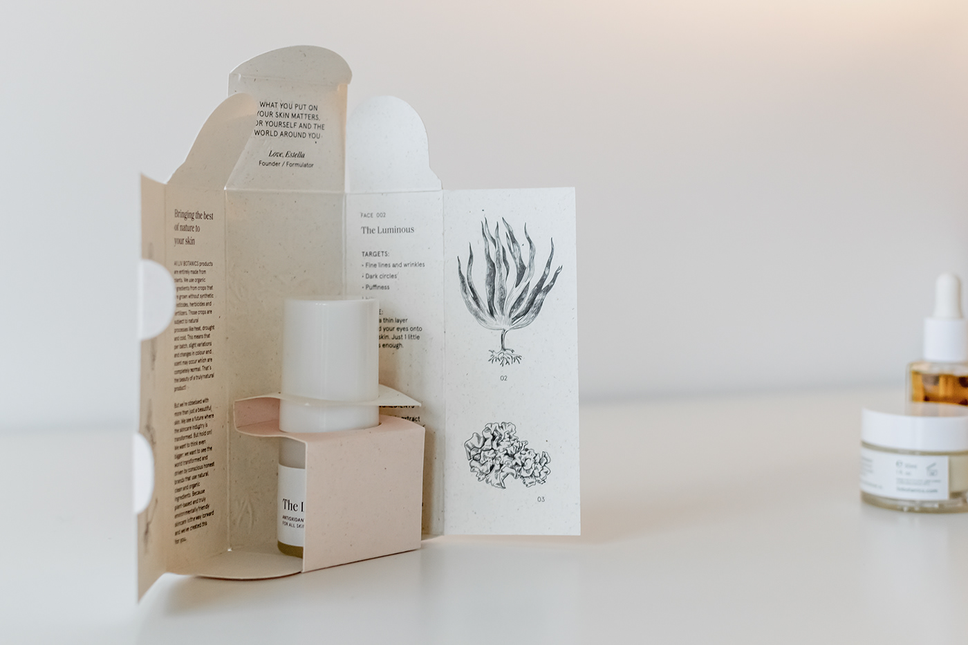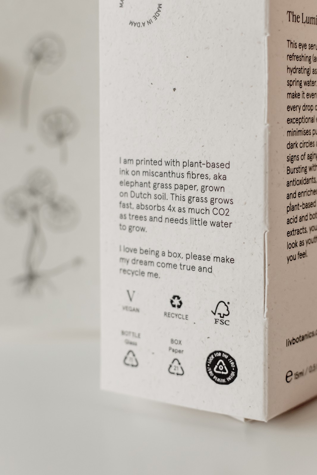 為了最大限度地減少品牌的碳足跡,我們在距離阿姆斯特丹市幾公里遠的大象草纖維上使用植物基無毒墨水進行本地印刷。主包裝盒不使用膠水,展開平展,展示每種產(chǎn)品中包含的關(guān)鍵成分的植物圖及其植物名稱和信息。用于瓶子和罐子的標簽不含塑料,而用于運輸?shù)亩壈b、紙帶和包裝紙是 100% 可回收和可回收的,并使用無毒的植物性油墨印刷。