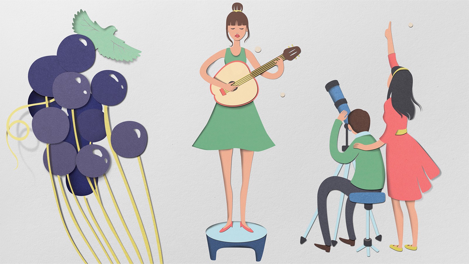 設(shè)計(jì)限制之一是無法使用水果攝影或逼真的插圖。出于這個(gè)原因,我們用剪紙技術(shù)創(chuàng)作了插圖,描繪了日常生活中的情景。水果始終存在,但成為有助于描述每個(gè)包裝背后的場景和故事的元素。這些故事與孩子們產(chǎn)生了聯(lián)系,而插圖、每種口味的鮮艷色彩和中心的標(biāo)志有助于突出貨架上的包裝。