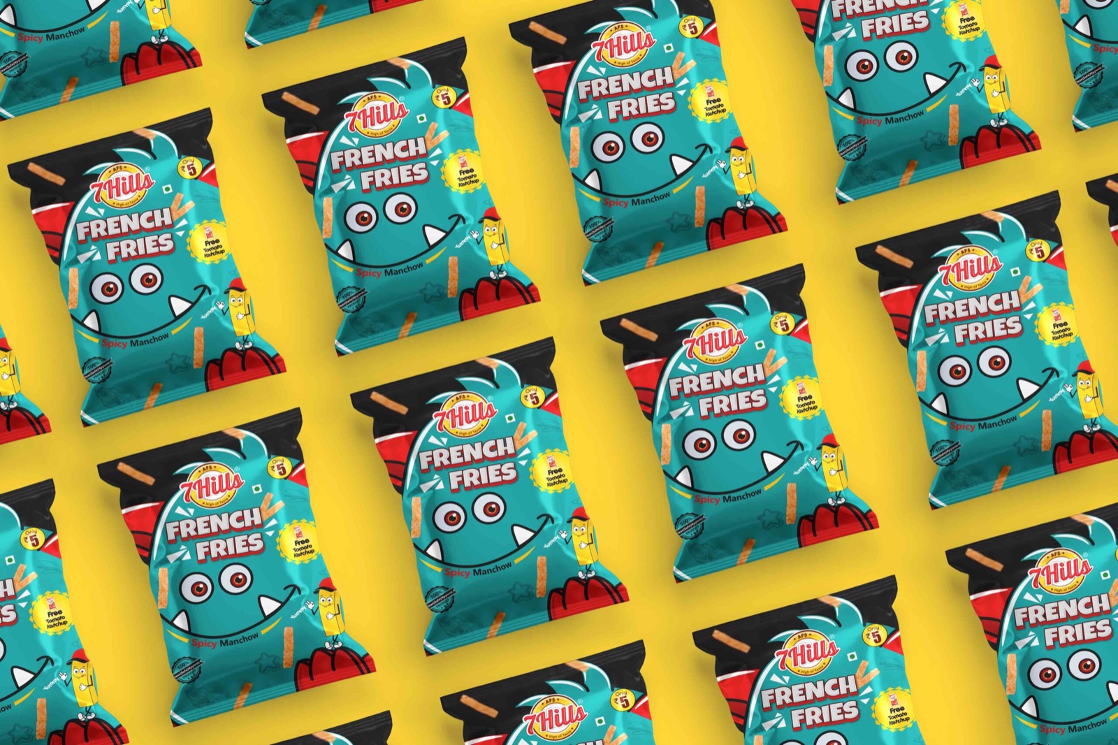 薯條:這包薯條的設(shè)計考慮到了薯條的辣味。包裝上的人物是一根薯條,戴著一頂可愛的帽子,這是通過繪畫創(chuàng)作的。這個設(shè)計的中心人物是水色的。