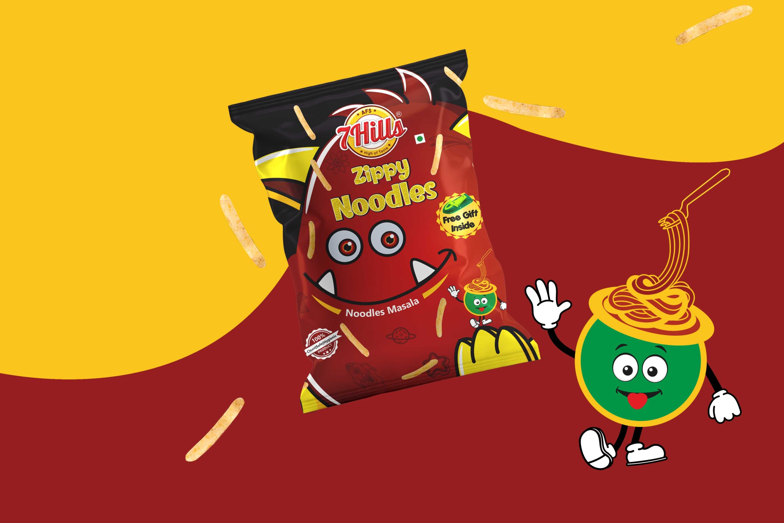 馬薩拉面:這個包裝的設(shè)計考慮了馬薩拉面的美味。包裝上的文字是一碗面條,是通過繪畫創(chuàng)作的。這個設(shè)計的中心人物是深紅色。