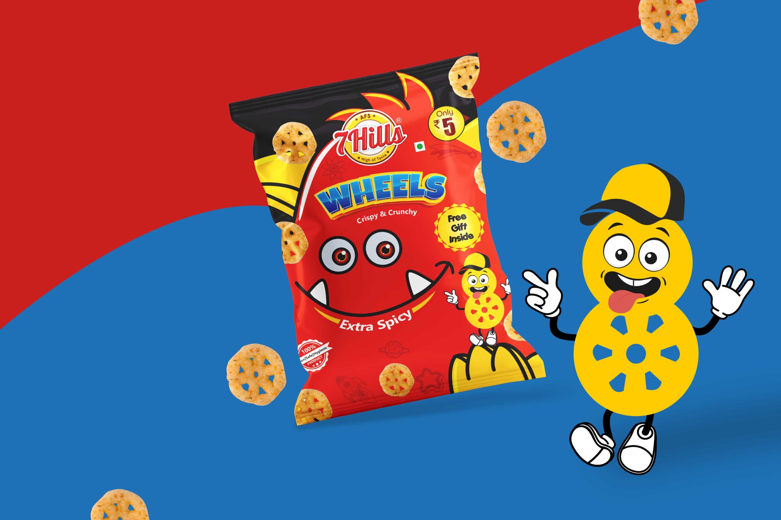 辛辣車輪:這款包裝的設(shè)計考慮了辛辣口味的脆車輪。包上的字符是一個有趣的輪子字符,由繪圖創(chuàng)建。這個設(shè)計的中心人物是紅色的。由于增加了有趣的角色,這些包對孩子們來說變得更具互動性。