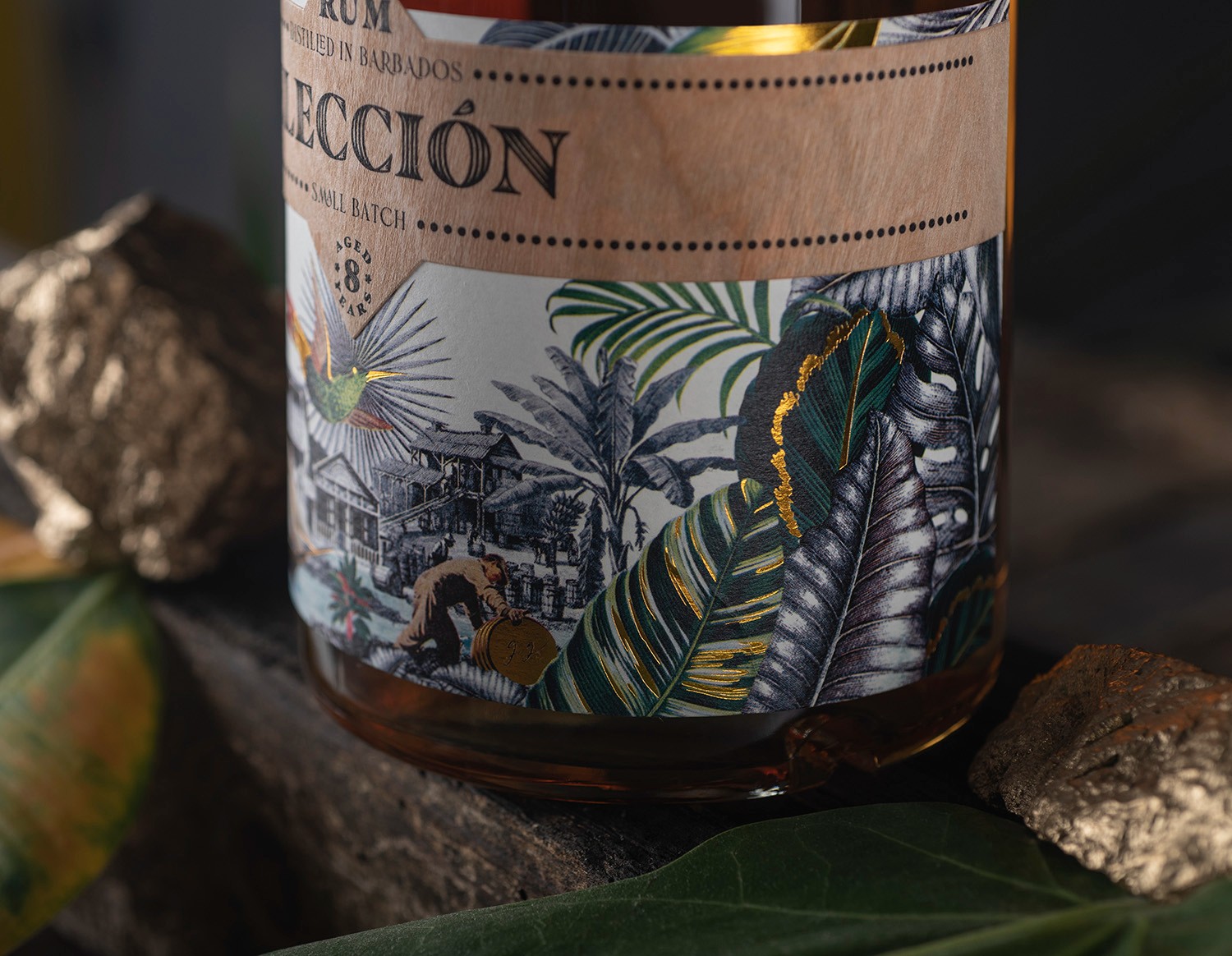 為Ron Elección的意大利客戶設(shè)計包裝。這種朗姆酒在巴巴多斯蒸餾,但在阿瑪龍酒桶中陳釀,這是意大利的典型做法。