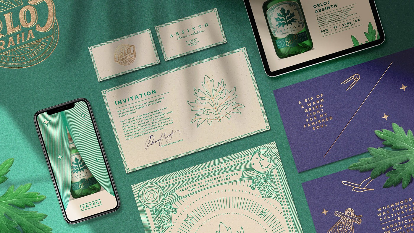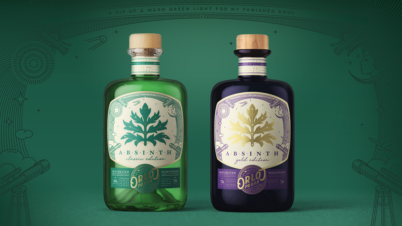 任務:為傳統(tǒng)的捷克苦艾酒開發(fā)標簽設計。捷克共和國是一個眾所周知的苦艾生產(chǎn)國,這不是什么秘密。每年都有很多游客來這里品嘗各種神秘飲料。布拉格,捷克共和國的首都,以一種中世紀的天文鐘而聞名于世,名為Orloj。這只鐘于1410年首次安裝,使它成為世界上第三座最古老的天文鐘.去年,兩家酒精生產(chǎn)商決定合作制作一款新的高質量版的苦艾酒。他們采用了一種傳統(tǒng)的捷克苦艾汁配方,并將其與首都的象征相結合,并出現(xiàn)了新的天文苦艾酒,名為“Orloj”。它決定制作兩種版本的飲料:經(jīng)典(浸漬)和金色(蒸餾)一。我的任務是創(chuàng)建一個產(chǎn)品的標志,標簽設計和產(chǎn)品的基本視覺標識。