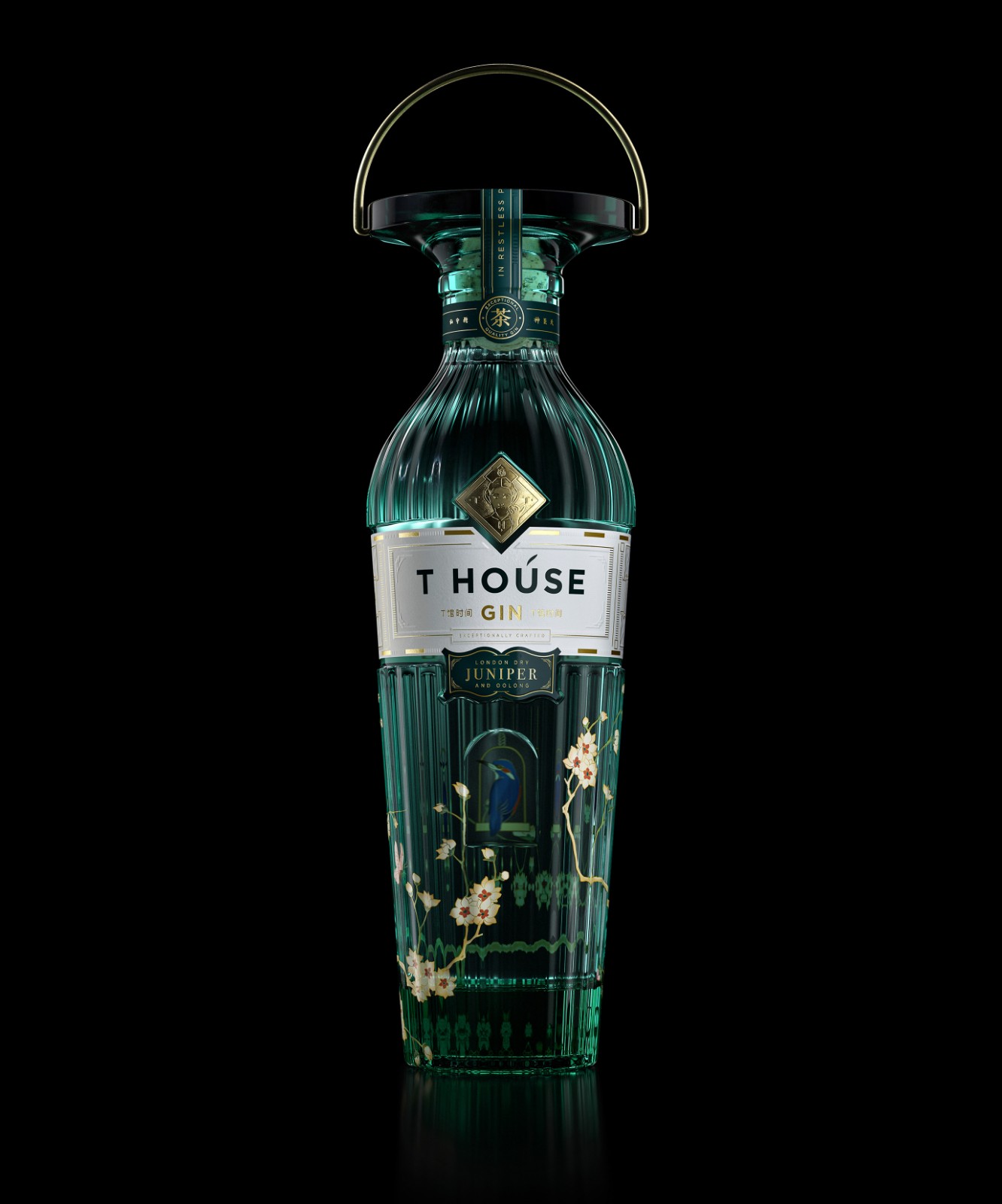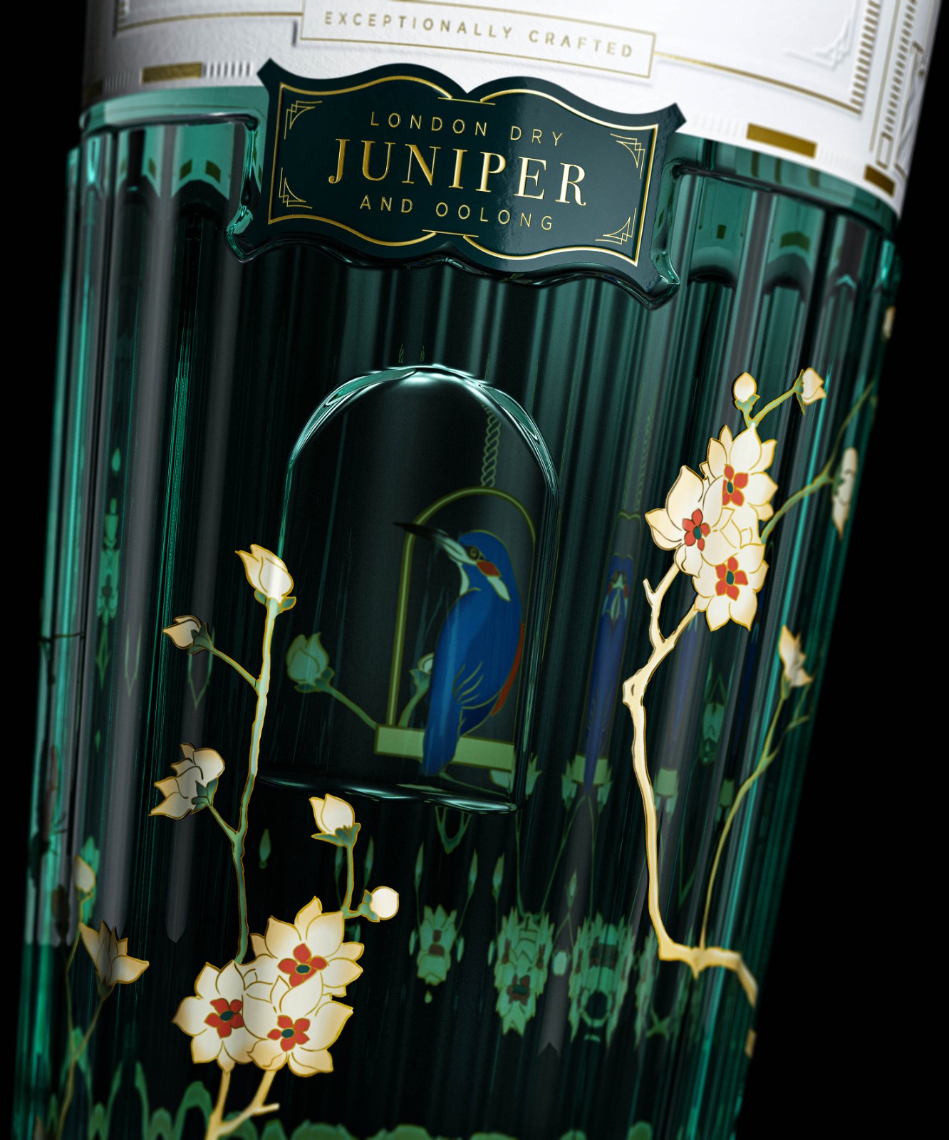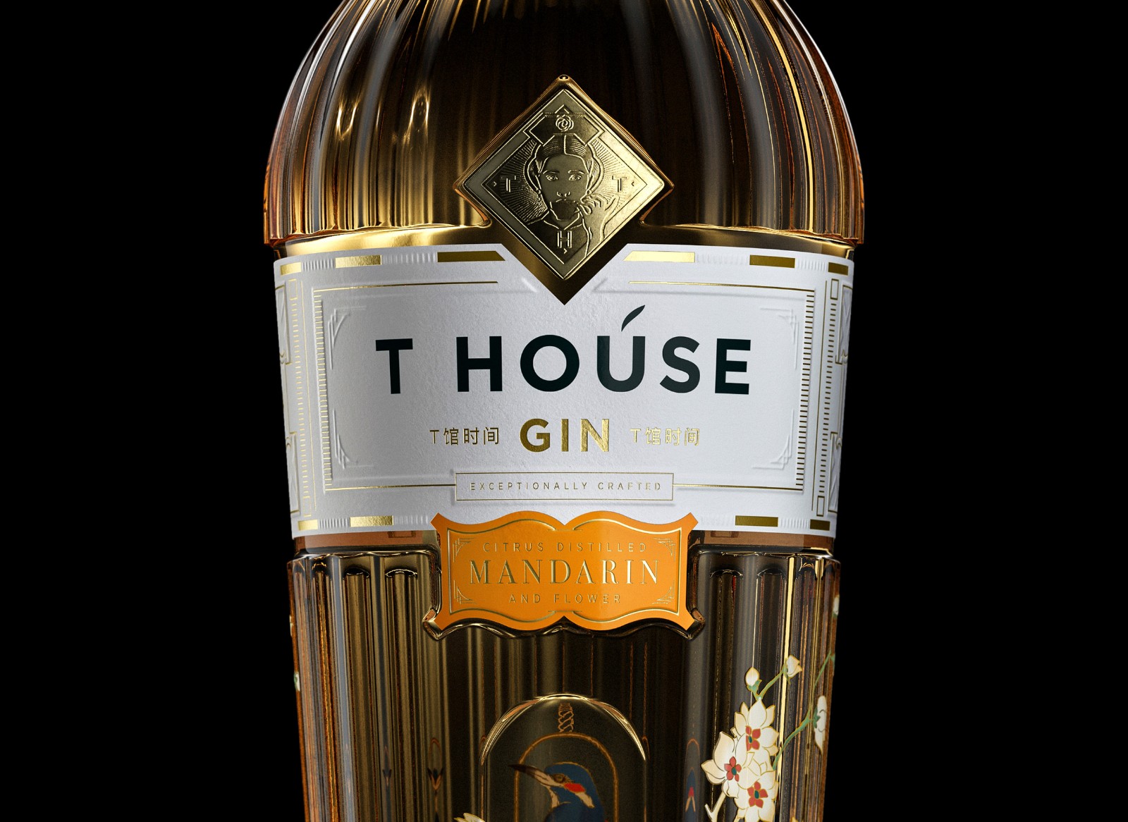 瓶身的設(shè)計(jì)靈感來自鳥籠的功能,而玻璃塞子則受慈禧皇后佩戴的傳統(tǒng)頭飾的影響。插畫風(fēng)格和技巧靈感來自清朝代花瓶,并營造出籠中鳥兒的錯(cuò)覺。瓶子掛在盒子里完成概念。